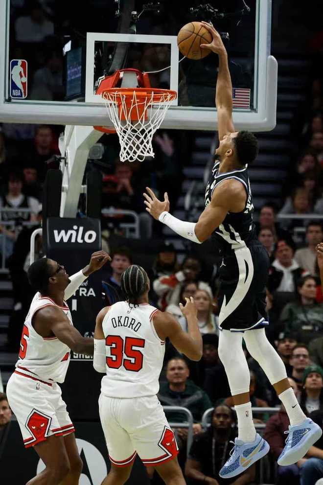 中场休息回来,雄鹿连续两节得分30+,且限制公牛前三节均是单节得分不足30分。公牛率先一波7-2攻势反超4分,字母哥连续冲击内线得分,尤其是完成精彩隔扣,引领一波18-2攻势反超12分优势。公牛一波9-0攻势追分,雄鹿打出6-1攻势再度拉开比分。雄鹿之后继续微弱优势压制公牛,雄鹿单节32-28净胜4分,三节结束雄鹿85-80领先公牛。前三节比赛,吉迪15分11助攻与布泽利斯18分,引领公牛5人得分上双,字母哥22+13+6+2+2引领雄鹿4人得分上双。