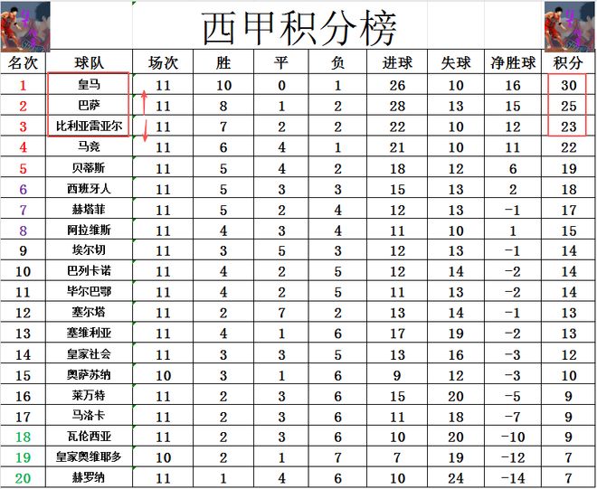 积分榜方面,巴萨击败埃尔切后及时止住颓势,超过比利亚雷亚尔2分重回前2,和上轮一样,还是落后皇马5分。贝蒂斯大胜马洛卡,超过输球的西班牙人1分,重回前5,落后第4的马竞3分。